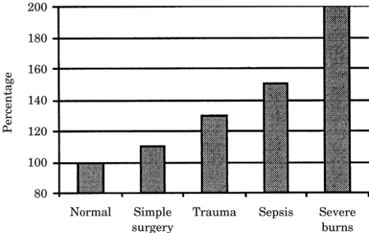 hypercatabolism, hyperglycemia, suppressed immunity,