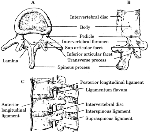 B: Lateral view; C: Ligaments of the spine. |